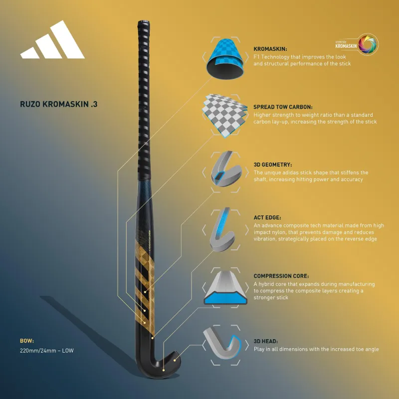 3D GEOMETRY: The unique adidas stick shape that stiffens the shaft, giving increased hitting power and a cleaner, sharper finish. The cut away under side of the stick helps to lift the ball more easily.